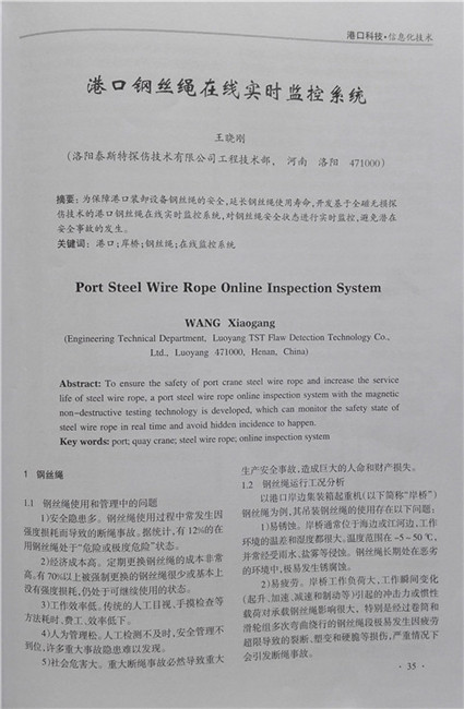 隨著公司新市場開拓不斷深入,市場反響逐漸升溫,尤其是面對港口行業(yè)對鋼絲繩安全問題關(guān)注度和解決方案渴求的急劇提升,針對港口行業(yè)的特殊工況環(huán)境和安規(guī)范要求,我公司和某港口達成戰(zhàn)略合作伙伴友好關(guān)系,為該港現(xiàn)場各類提升設備鋼絲繩提供安全監(jiān)測方案。豐富完備的港口現(xiàn)場數(shù)據(jù)和行業(yè)的鋼絲繩磁檢測技術(shù)結(jié)合成系列港口用鋼絲繩在線實時智能監(jiān)測系統(tǒng)。為了推而廣之向更多港口客戶提供TST產(chǎn)品保障安全的科技力量,同時也為了讓港口客戶對TST產(chǎn)品及技術(shù)方案在港口適用性有充分詳細的了解,TST 公司在港口行業(yè)權(quán)威性期刊《港口科技》2016年3月刊出《港口鋼絲繩在線實時監(jiān)控系統(tǒng)》論文。