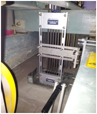 根據現場工況條件,經充分技術評估曳引輪部位上安裝套探傷前置裝置來檢測鋼絲繩;對鋼絲繩實施非接觸式在線實時探測,不影響鋼絲繩自身的正常生產運行;整體結構設計為隨動形式,工作過程中可跟隨鋼絲繩排繩運動和鋼絲繩的抖動、跳動;整體可旋轉,在設備檢修期間(如鋼絲繩換繩、夾持輪維護)可將前置探傷裝置旋離鋼絲繩,檢修完畢后重新上線檢測。